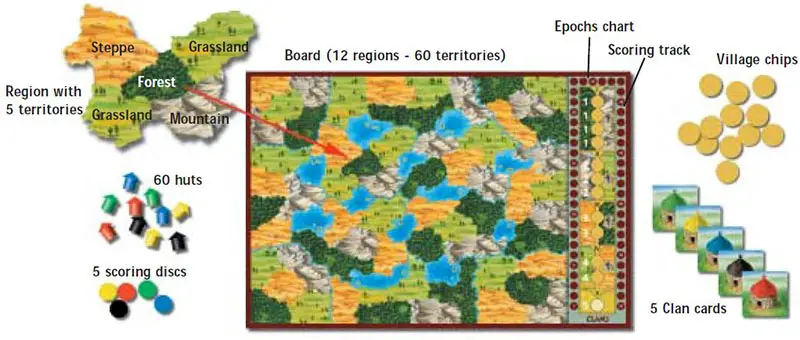 The 60 territories are of 4 types: forests (dark green), mountains (light gray), steppes (tan) and grasslands (light green). Also on the board, but separated from the playing area, are a chart of the five epochs of play and a scoring track of 60 spaces.