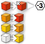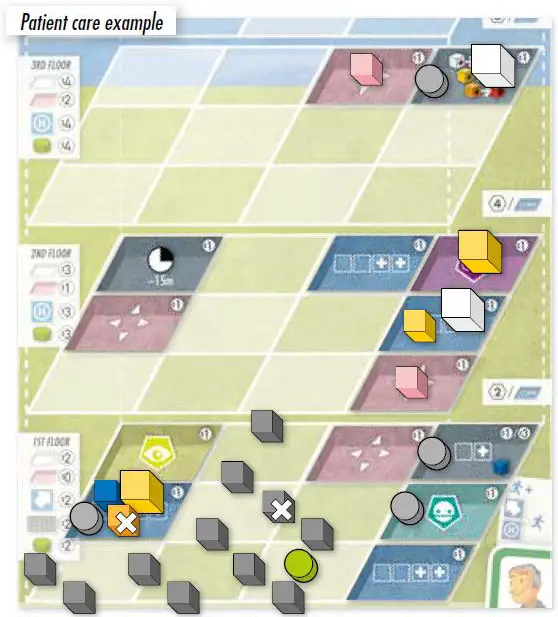 Doctors (large cubes) are also white, yellow, orange, or red. Each color of difference between the Doctor and the Patient requires 1 Nurse (small blue cube