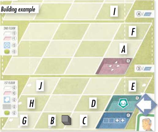 You could build a Room at A. Because it's already adjacent to an Office, you wouldn't have to build another as a bonus action, but you may choose to build one above it anyway ($ 2, because it's Floor 2). A Room at A couldn't hold Patients yet, because there are no Services on Floor 2.
