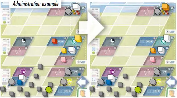 Each round is divided into several phases. First, there are three Action phases, then Movement, Business, and Administration, as follows:
