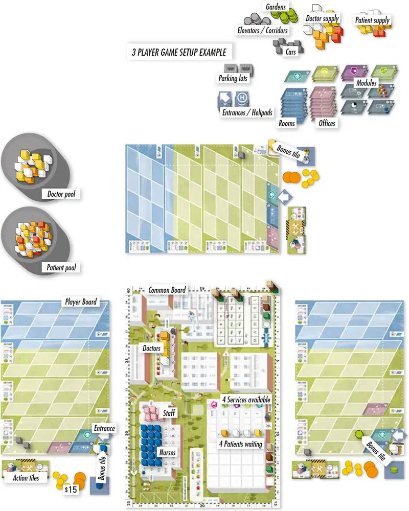 Everyone simultaneously: Build for free your initial clinic according to the Building Rules. Place your Doctor on your Entrance. Park her car according to the Parking Rules.
