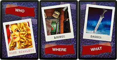 The players must determine the answers to these three questions: Who killed him? Where? and with What Weapon?