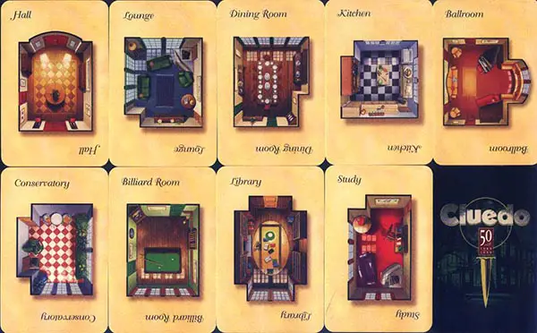 - Pak kaarten: 1 kaart voor elk van de 6 verdachten, 6 wapens en 9 kamers