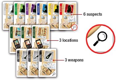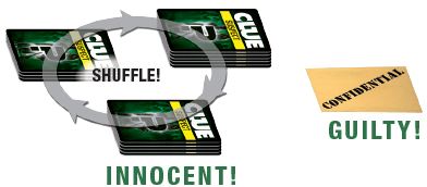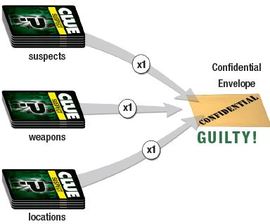 Without looking, place one card from each pile facedown in the Confidential Envelope. This is the crime, and stays secret until someone makes an accusation.
