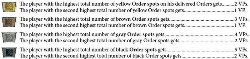 For each of your delivered Orders, gain the amount of Victory Points (VPs) stated at the top of that card by advancing your Victory Point marker on the Score track accordingly.