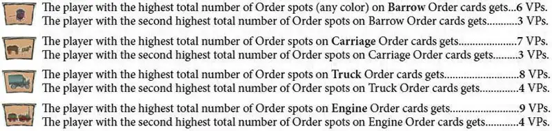 - For each Order card left in your Outstanding Orders area, you lose 1 VP. (Move your Victory Point marker on the Score track backwards).