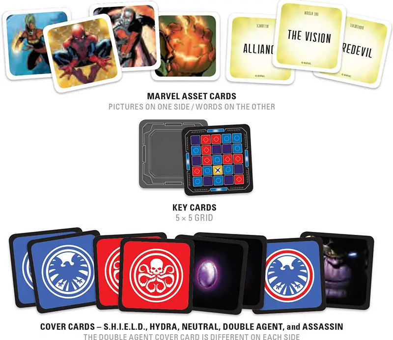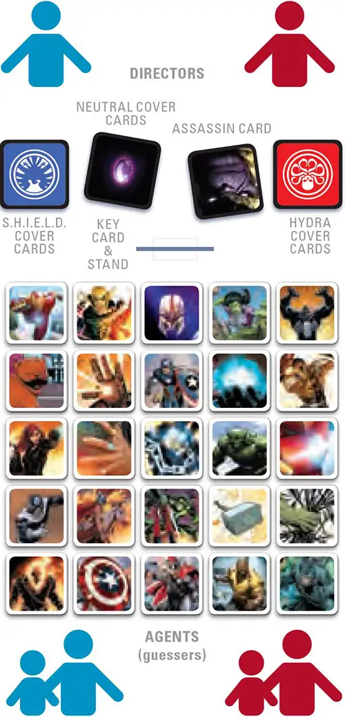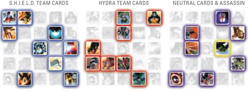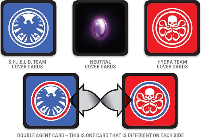 The HYDRA Team Cover Cards are placed in front of the the HYDRA Team Director and the S.H.I.E.L.D. Team Cover Cards are placed in front of the S.H.I.E.L.D. Team Director. The Neutral Cover Cards and the Assassin Cover Card are placed in the center near the Key Card on the Stand.