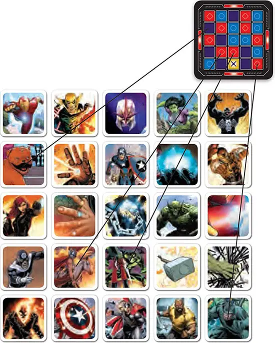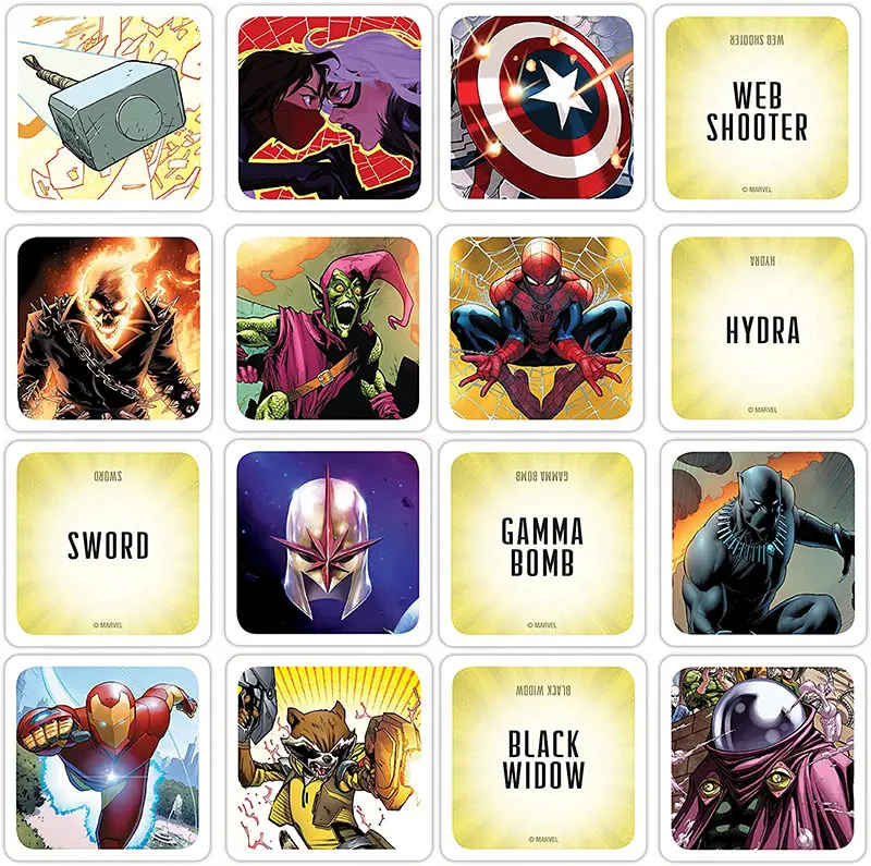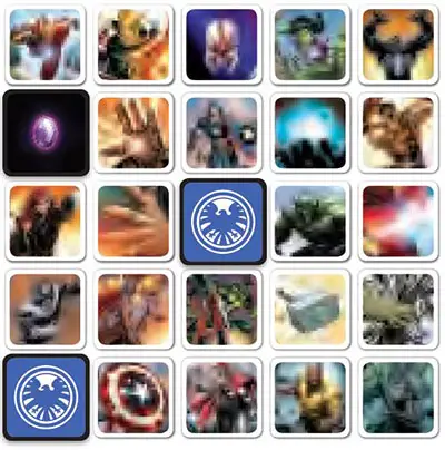 Two opposing teams are competing to be the first to identify all of their team's Marvel Asset Cards from among 25 cards displayed in a 5 x 5 grid.
