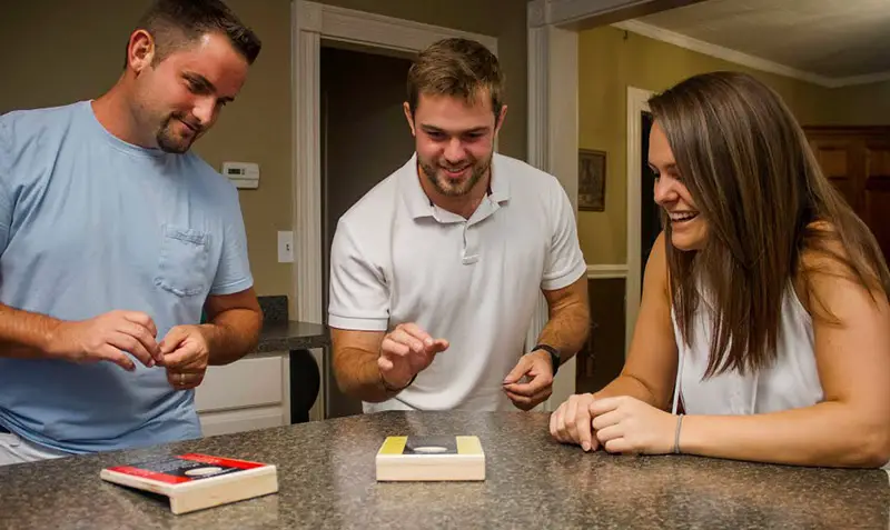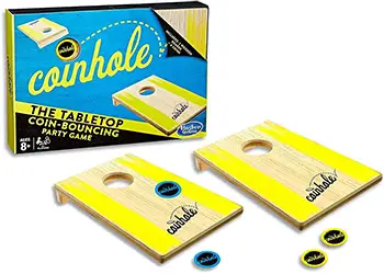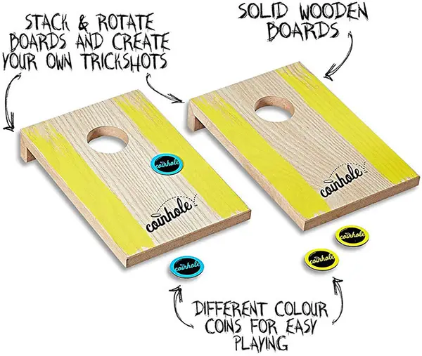 There are three games you can play with this COINHOLE set. In every game, you will be bouncing coins and trying to get them into the hole. Coins must first bounce off the surface in front of the board.