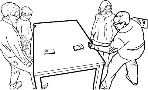 The four players should be spread around the table. Each player begins with one coin. Two players on opposite sides of the table are chosen