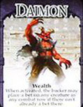 When you activate the Daimon's special power, you may immediately place one bet on any creature in any combat row that does not already have a bet there, including previous combat rows.