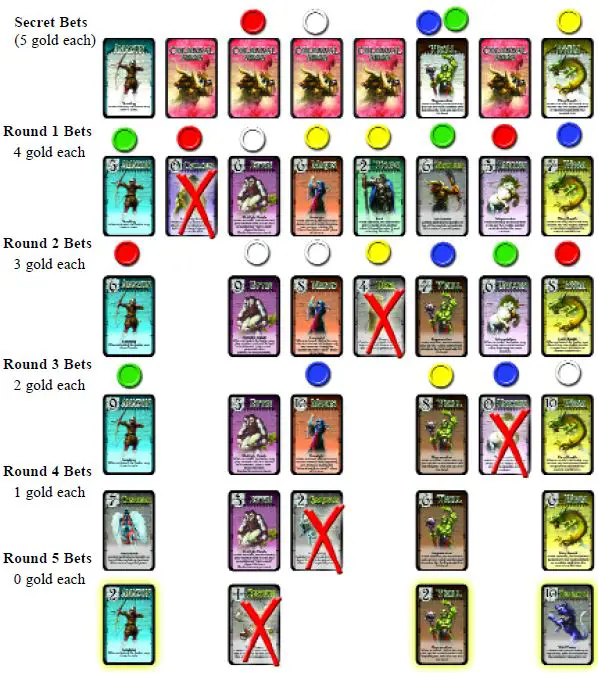 In addition, each player has the option of making one secret bet in the first round that is worth 5 gold if it pays out. Secret bets are explained in more detail later.