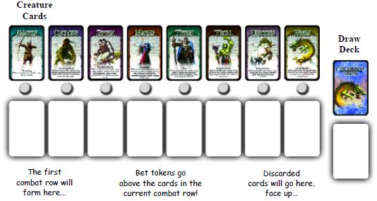 At the end of the game, you will usually have a total of 6 rows of cards (the row of creature cards, and one row of combat cards for each of the 5 rounds of play below that. See the end of these rules for an example of what the playing area might look like at the end of a game).