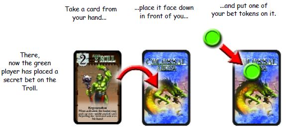 To place a secret bet, choose a combat card from your hand that corresponds to the creature you wish to bet on. Place it face down in front of you, then place one of your bet tokens on top of it.