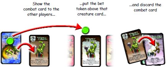 Instead of placing a bet during your turn, you can choose to reveal your secret bet to the other players. To do this, turn the combat card underneath your bet token face up and show it to the other players. Next, place the bet token above the corresponding creature card (not above the current combat row) and discard the combat card.
