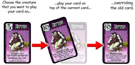 When you play a combat card, place it in the current combat row in the same column as the creature depicted on the card. You may not play combat cards depicting eliminated creatures. If there is already a card in that position, cover it up completely with the new card-the old card is overridden and players may not look at it while it is covered by another card.
