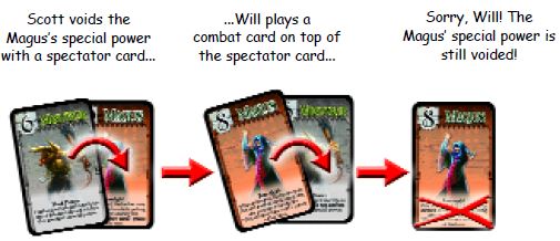 Example: Scott plays a spectator on the Magus, covering up its current combat card. On the next turn, Will (who is the Magus's backer) plays a Magus combat card on the Magus, covering up the spectator. Because the Magus combat card was used to cover a spectator, Will cannot activate the Magus'special power!