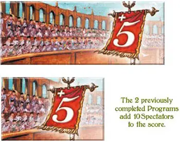 During the game a player will produce many different events starting with simple ones and moving to more ambitious events. Each time a new event is presented, the Event Program of any previously produced events is turned over and counts for 5 additional spectators until the game ends.