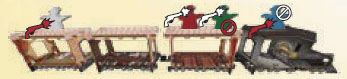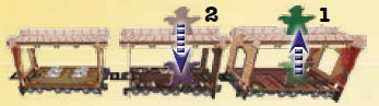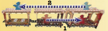 2. When you are on the roof, however, you can shoot a Bandit who is in your Line of Sight and on the roof of any Car other than your own, regardless of the distance. A Bandit is in Line of Sight if there is no other Bandit between you and him. Two Bandits on the roof of the same Car are considered as being side by side, and not located one behind the other: you choose which one gets hit.