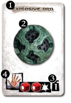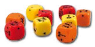 They are used to resolve actions such as attacking or defending. Each axe symbol on a face represents one success. The dice come in three colors to indicate the chances of rolling successes. In order: yellow is the least likely to roll successes, followed by orange, and finally red, which has the best chances of rolling successes.