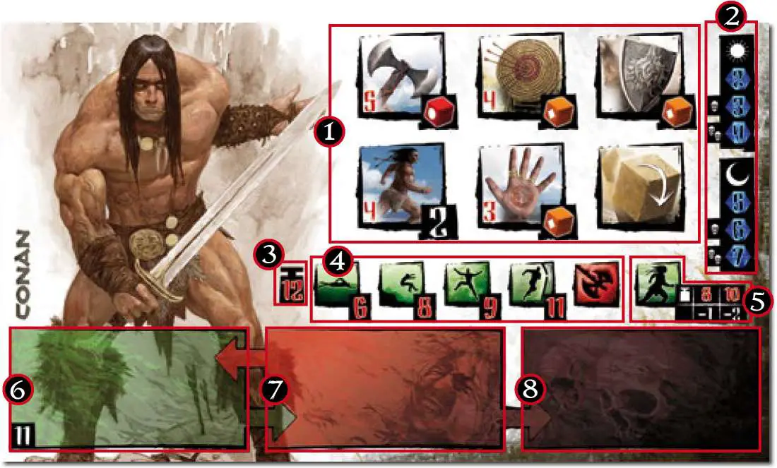 These spaces represent the 6 actions a hero can perform and indicate their exertion limit and the hero's attribute for each action. The attribute's level is indicated by the color of the die associated with the action, or by the base movement value in the case of the Movement action (See page 15).