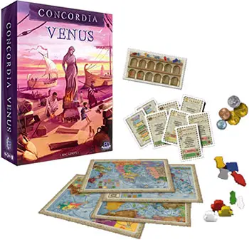 Concordia Venus offers two different variants: The Individual Play for 2 to 5 players, and the Team Play for 4 or 6 players (in 2 or 3 teams). Most game rules apply to both variants. It is clearly indicated if any rules apply only to the Individual or the Team Play variant.