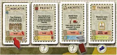 Individual Play variant: The picture shows the personality cards recently played by the other 4 players. The 5th player plays a Diplomat card. He now may either execute the action of a Senator, an Architect, or a Prefect.