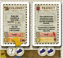 Example: A player who until now has played 4 cards now plays his Tribune card. Therefore he takes a total of 5 cards back into his hand and receives 2 sestertii from the bank.