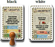 Black and White play as one team: Black would like to build houses, but not owning an Architect he plays the Legatus instead.