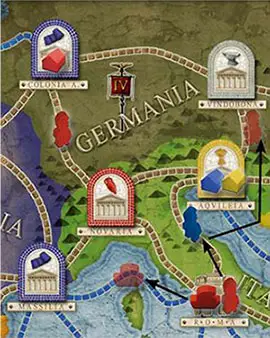 The sea colonist from "Roma" moves onto the sea line to "Massilia" (1 step), and the land colonist makes 2 steps onto the line between "Aquileia " and "Vindobona".