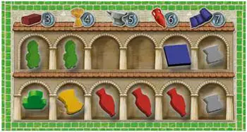 In the situation depicted above a player who chooses the cash bonus would get 10 sestertii from the bank, because there are 10 coins visible on all bonus markers.
