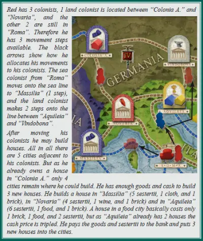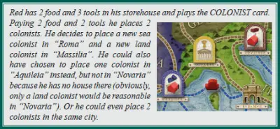 a) The player may place new colonists on the game board each to be paid for with 1 food and 1 tool. New colonists can be placed inside "Roma" or inside any other city where the player owns a house.