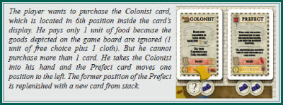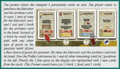 The player may purchase one personality card from the display on the game board and take it into the hand. The price consists only of the goods depicted inside the red field of the personality card. Any goods depicted beneath the card's position on the game board are ignored. As with a SENATOR, the remaining cards inside the display move to the left if their left position is empty, and the display is replenished from the stack (as long as the stack exists).