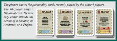 Players execute their turns in clockwise order. A player's hand consists of his un-played personality cards. A player's turn consists of playing 1 card from their hand and executing the related actions. All played cards form a personal discard pile showing only the last card played. With the Tribune, a player takes back all cards previously played.