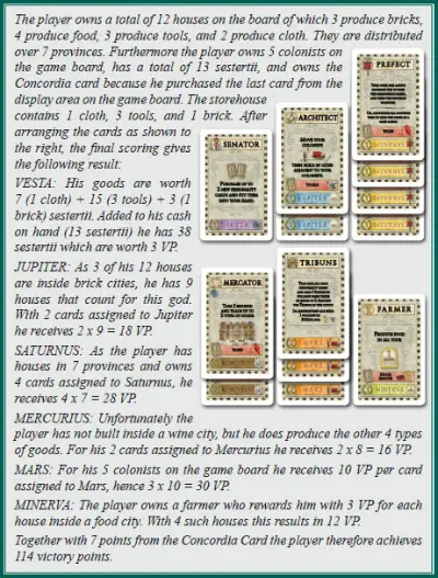 The game ends either after a player purchases the last card from the display on the board, or after the first player builds his 15th house. In either case, this player is awarded the Concordia card. Now all other players execute their final turn and then all players tally their final victory points.