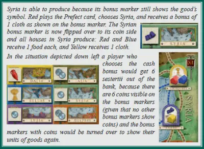 b) Instead of producing the player may choose to collect the cash bonus. For every visible coin on the bonus markers he receives 1 sestertius from the bank. Afterwards all bonus markers are flipped back to the side showing their good's symbol.