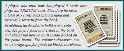 The player recovers all of his previously played cards back into his hand. If the player takes back more than 3 cards (including the Tribune in the count), he receives 1 sestertius per card past the 3rd from the bank.