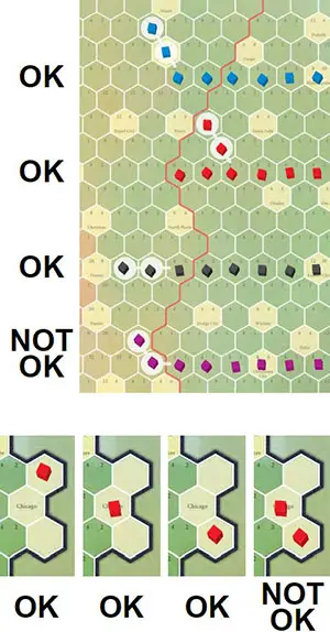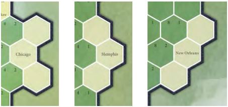 Starting Cities (Chicago, Memphis and New Orleans) are groups of three distinct hexes.