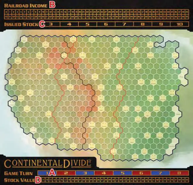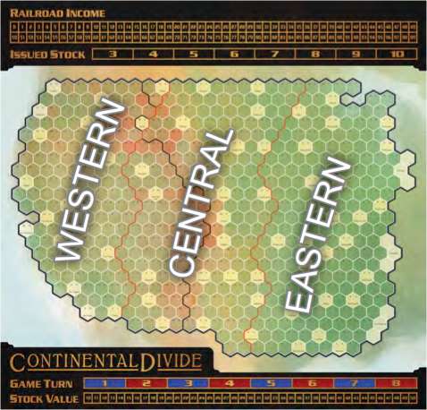 Building into the Central Region unlocks ten more cubes. Building into the Western Region unlocks the ten remaining cubes. Crossing the black Continental Divide line immediately advances the railroad's cube on the Income Track ten spaces.