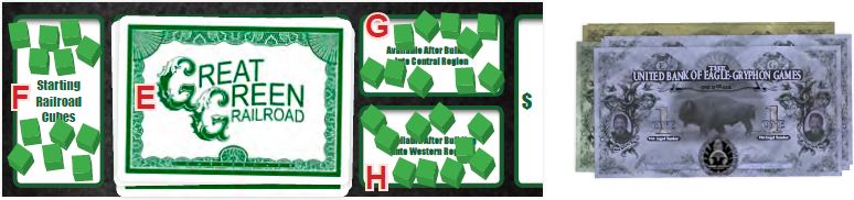 On the railroad's Charter card, the player leaves the unsold stock in the certificates area E and 12 cubes in the Starting Railroads area F. The rest of lhe cubes will become available as the railroad builds west:, into the Central and Western Regions. Place 10 cubes in
