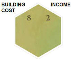 Each hex has a build cost number (left) and an income provided number shown in the hex.