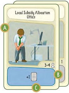 B The numeral directly below the picture on the right-hand side indicates in which section (1 to 5) of the game the card is placed in the federal department. The four normal offices for 3-4 or 4 players show the player symbol here.