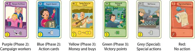 Hint: In this phase purple actions help you recruit more campaign workers, who can help you to get more lucrative offices, while blue actions let you draw more cards. You use all green and yellow actions only in the next phase, as these let you buy new cards or give you victory points.
