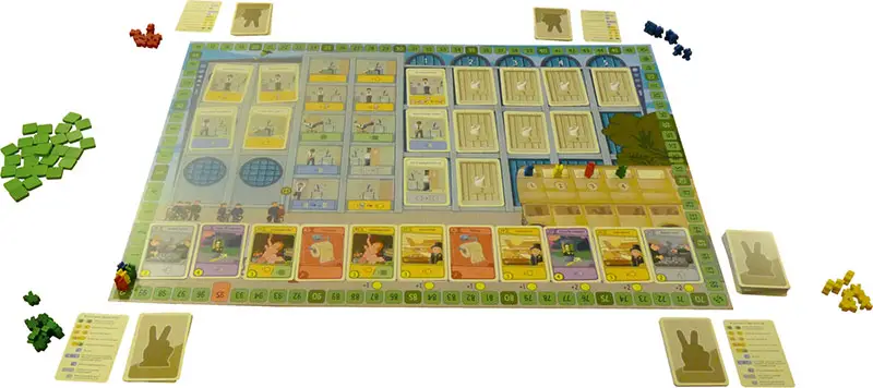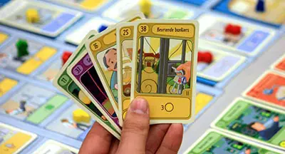 The number of depicted people above these spaces indicate how many cards must be removed: For example, all the unsold cards from the first two spaces are removed for a three-player game.