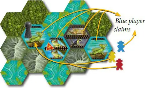 Again, if a player claims the tiles, the tiles and their explorer are removed from the board and placed in front of them, and the remaining explorers are moved to the spot on the board where the last tile was revealed.