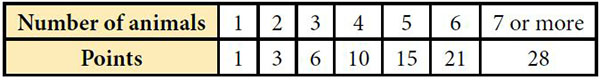 In addition, you score a bonus 20 points for having at least one of each of the six animals. You score 20 bonus points for every set of six different animals that you have.