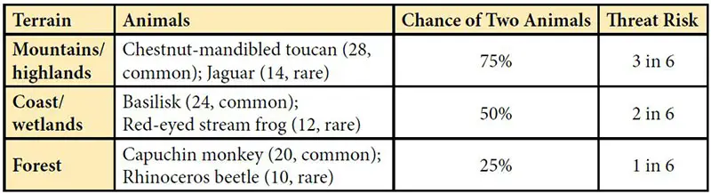 Each terrain has a common and a rare animal type, and each terrain has a different chance to find two animals instead of one, as well as differing levels of danger.