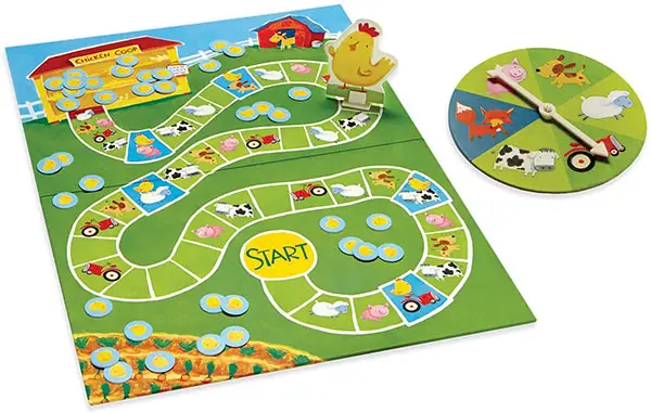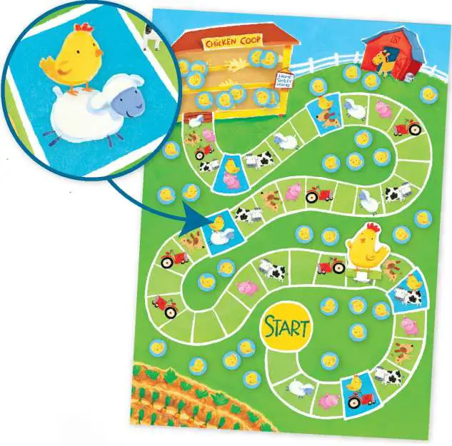 Open the board and lay it on a table or flat surface. Place Mother Hen on the Start space. Scatter the Baby Chicks around the farm, but not on the path. Place the spinner nearby.