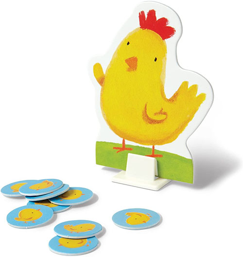 The Baby Chicks have flown the coop and are running loose on the farm! The object of the game is to help Mother Hen collect all her Baby Chicks and put them back in the coop by the time she reaches the last space on the board.
