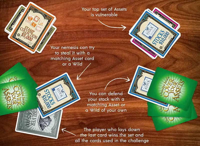 • The player you are challenging must have at least two sets of assets on their stack. Every player's first set is safe and can't be stolen. Hint: It's a great place to stash one of those highly-valued wild cards!